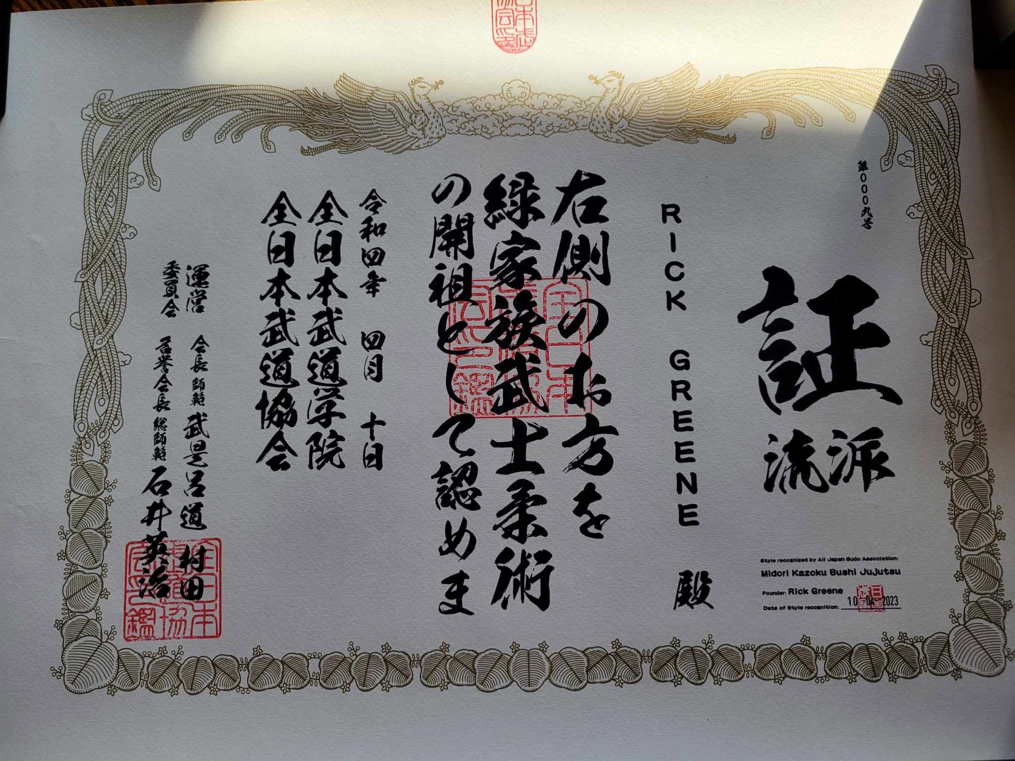 Midori Kazoku Bushi Jujutsu is registered style in Japan, with the Japan Budo International Federation, Rick Greene founder, www.japanbudo.com